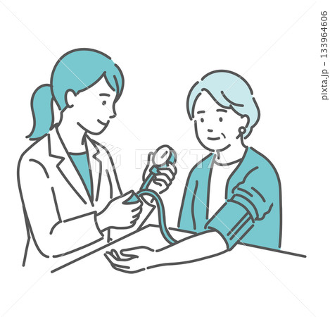 医療従事者による血圧測定のイラスト(診察・高齢女性)