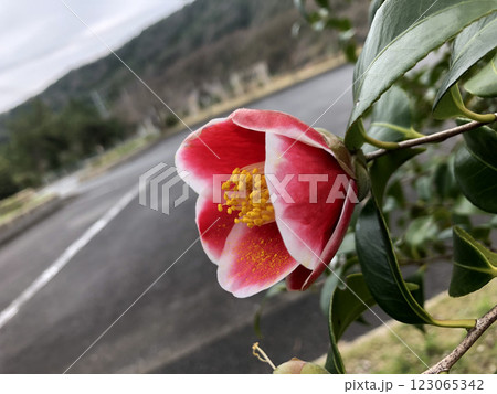 椿の島・大飛島に自生するヤブツバキの赤い花と北浦桟橋2 岡山県笠岡市