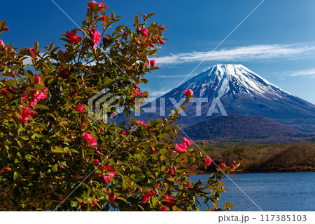 精進湖畔のサザンカの花と富士山