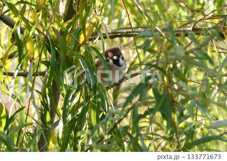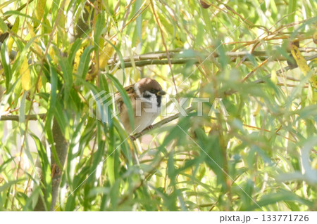 岩手県盛岡市中津川の川べりの楊の木に隠れて親を待つスズメの子