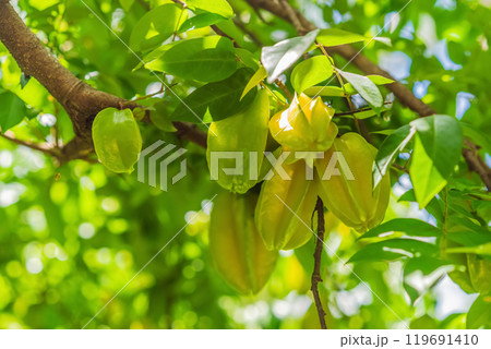Carambola, also known as star fruit. Star fruits growing on a tree. Tropical nature, agriculture, and organic produce concept