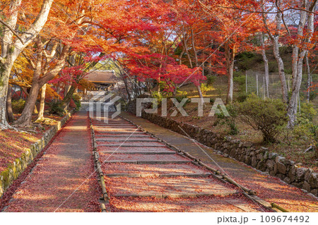 秋の京都 毘沙門堂 勅使門に続く坂道を染める敷紅葉