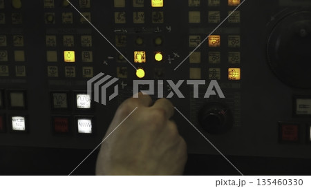 Technician operating industrial control panel with multiple buttons and lights. Stock clip