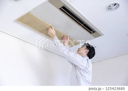 エアコン・空調設備の清掃,点検をする作業着の男性