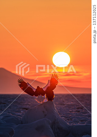 朝日に染まる流氷と飛翔するオオワシ(北海道・知床)