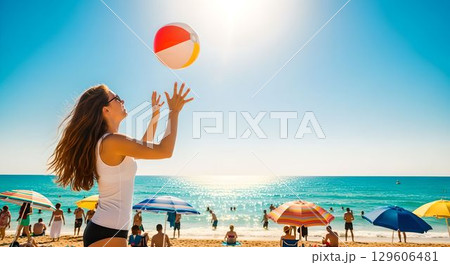 夏の海辺でビーチボールで遊ぶ女性 AI生成画像