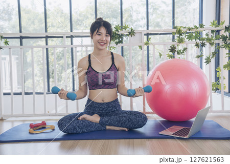 Beautiful Asian Women use dumbbell exercises for muscle-building home fitness. Women weight training smile use exercise pilates ball dumbbell. Beauty woman smiling sportswear on yoga mat home fitness