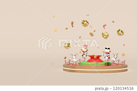 Carousel or merry go round with santa claus, reindeer, bag, coin, gift box, candy cane stick isolated on beige background. merry christmas and happy new year, 3d render illustration