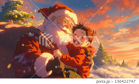 笑顔のサンタクロースと子供、アニメ風、夕焼け
