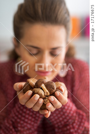 Closeup on young housewife enjoying freshness of shiitake mushro