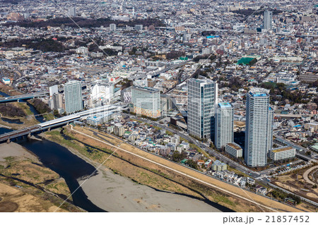多摩川緑地越しに望む二子玉川の高層ビル群と住宅街 東京都世田谷区