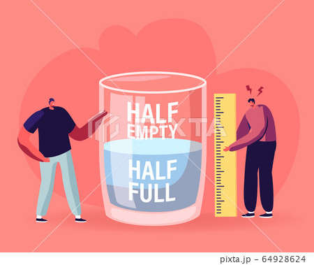 Optimist and Pessimist Concept. Couple of Characters Stand at Huge Water Glass Discussing if it is Half Full or Empty
