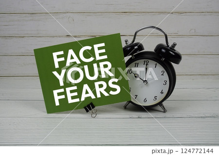 Face Your Fears text message on paper card with alarm clock on wooden background