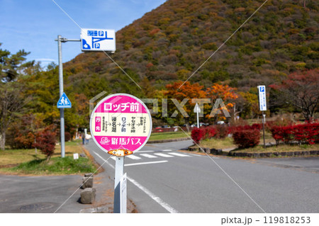 秋の榛名山 湖畔のバス停