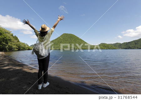 榛名湖を眺める若い女性