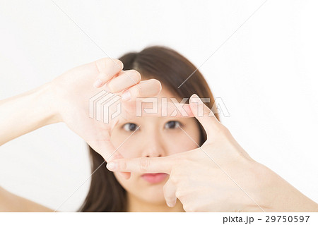 若い女性 トリミング ポーズ 指で構図 フレーミングをとる カメラ目線 笑顔 白バック