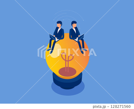 Two business person sitting on a light bulb working stock illustration