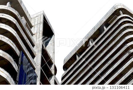 Construction of brutalist skyscraper. Tall building with raw exposed framework, modern facade,