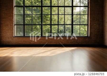 Modern interior with light wooden herringbone floor and white brick wall detail