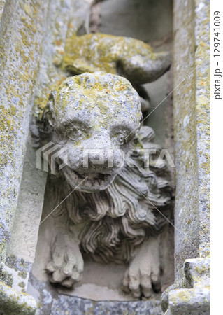 Detailed stone carving of a lion on Notre-Dame de Chartres Cathedral's facade in France