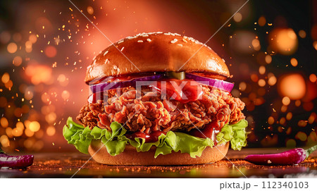 具材たっぷりの作りたてのハンバーガー。具材が飛び散るデラックスバーガー。