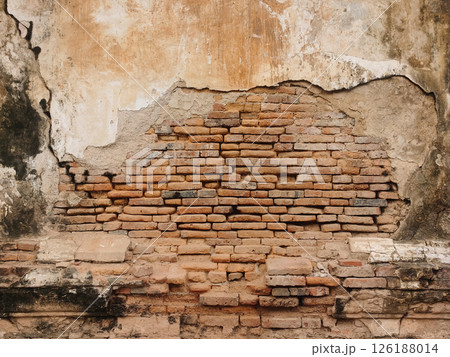 Picture of an old cement wall that has been cracked to reveal red bricks.