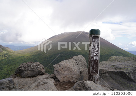 浅間山の外輪山の黒斑山の山頂標識と後方は浅間山 2023年9月19日
