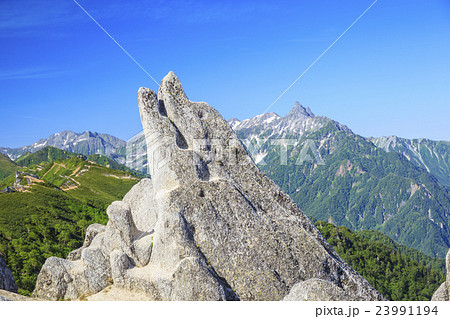 北アルプス燕岳のイルカ岩と槍ヶ岳 長野県大町市 安曇野市