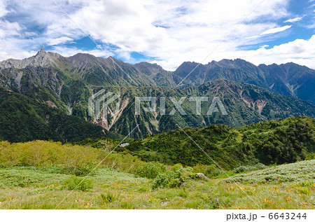 北アルプス飛騨山脈 小池新道から見た槍ヶ岳と穂高岳、鏡平山荘