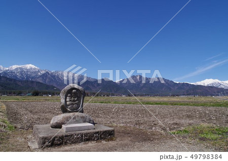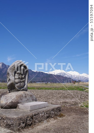信州 安曇野の道祖神 石仏と北アルプス 爺ヶ岳~鹿島槍ヶ岳を望む 大町市安曇沓掛駅近郊より