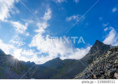 【山岳素材】槍沢カールから見る日の入りの槍ヶ岳と青空【長野県】