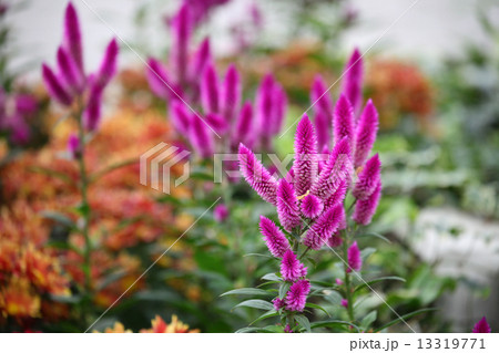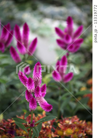 赤ピンクのケイトウ 花壇にて