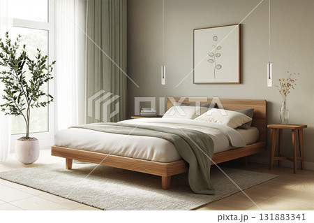 Modern bedroom interior design featuring minimalist wooden bed and soft green accents