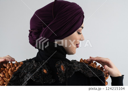 A stylish Muslim woman in a hijab presents her innovative handmade fashion accessory crafted from dried plums in a professional studio.