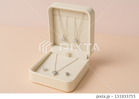 Elegant Jewelry Box Displaying Silver Necklaces and Earrings Pastel Background Luxury Accessories Product Photography