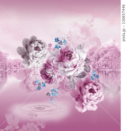 Beautiful pink flowers bouquet against a pastel pink striped background for modern decor