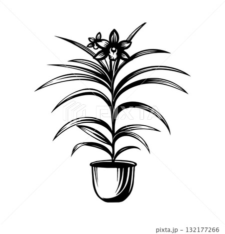 Potted Cymbidium orchid plant with flowers, line art style, on white background. Concept of nature
