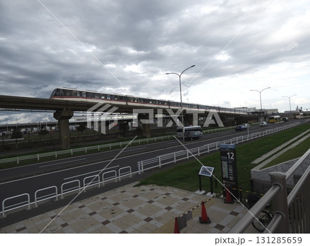 曇天の高架線を走行するモノレールと、空港へ向かう道路、ゲートサイン