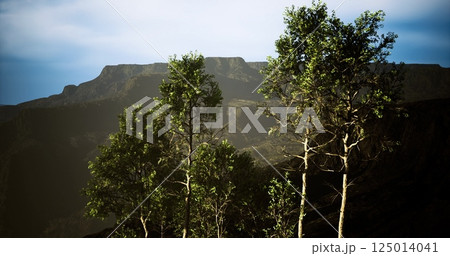 Green trees against a mountain backdrop on a clear sunny day