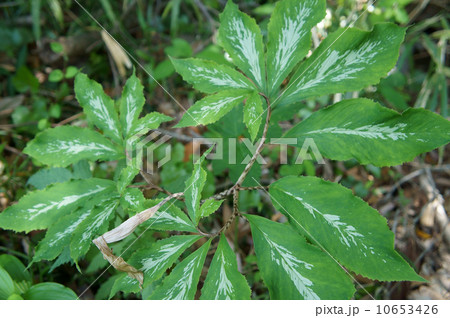 High angle view of plants Schismatoglottis Wallichii, green leaves with white streaks