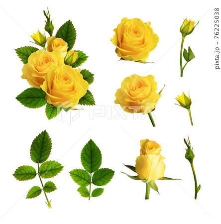 Set of yellow rose flowers, buds, leaves and example of arrangement
