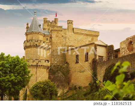 深緑の岐阜県郡上市の郡上八幡城の天守閣と隅櫓
