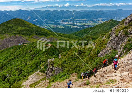 八ヶ岳連峰・権現岳へ向かう登山者と中央アルプス遠望