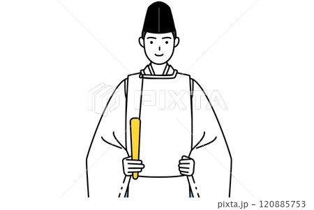 笏を持つ神社の神主、烏帽子と狩衣姿