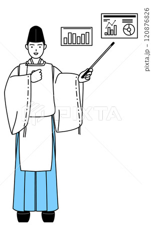 ホワイトボードを指示棒で指す神社の神主、烏帽子と狩衣姿