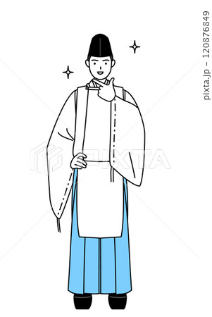 アイデアを思いついた神社の神主、烏帽子と狩衣姿