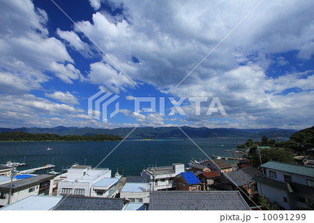 漁港の高台から眼下に広がる秋の空と雲と海と島