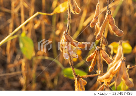 Ripe soybean pods. Soybeans close up in a field. Soy growing in the field