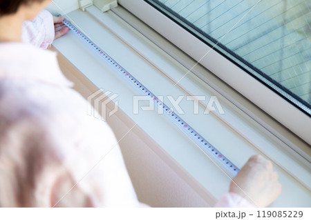 マンションの窓辺でカーテンのサイズを測るミドル女性