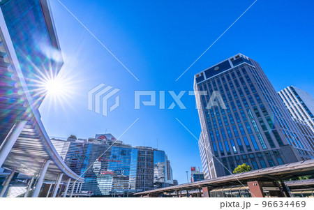 日本の横浜都市景観 3月。青空に映える横浜駅前の横浜ベイシェラトンホテルや横浜タカシマヤなどを望む
